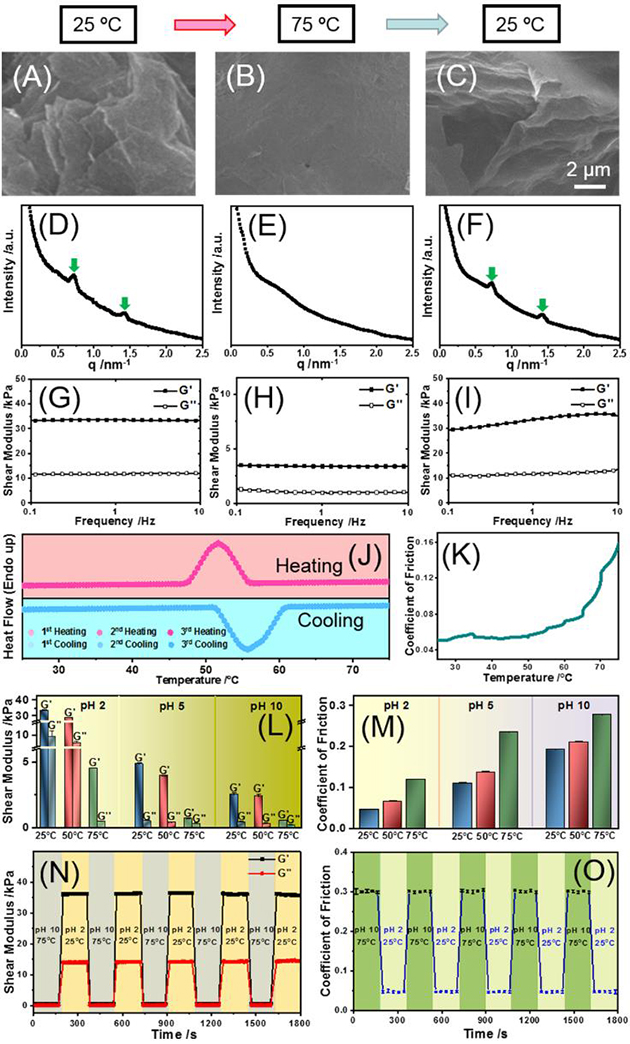 圖3. 水凝膠的熱響應性及pH和溫度對水凝膠機械和摩擦學性能的雙驅動行為