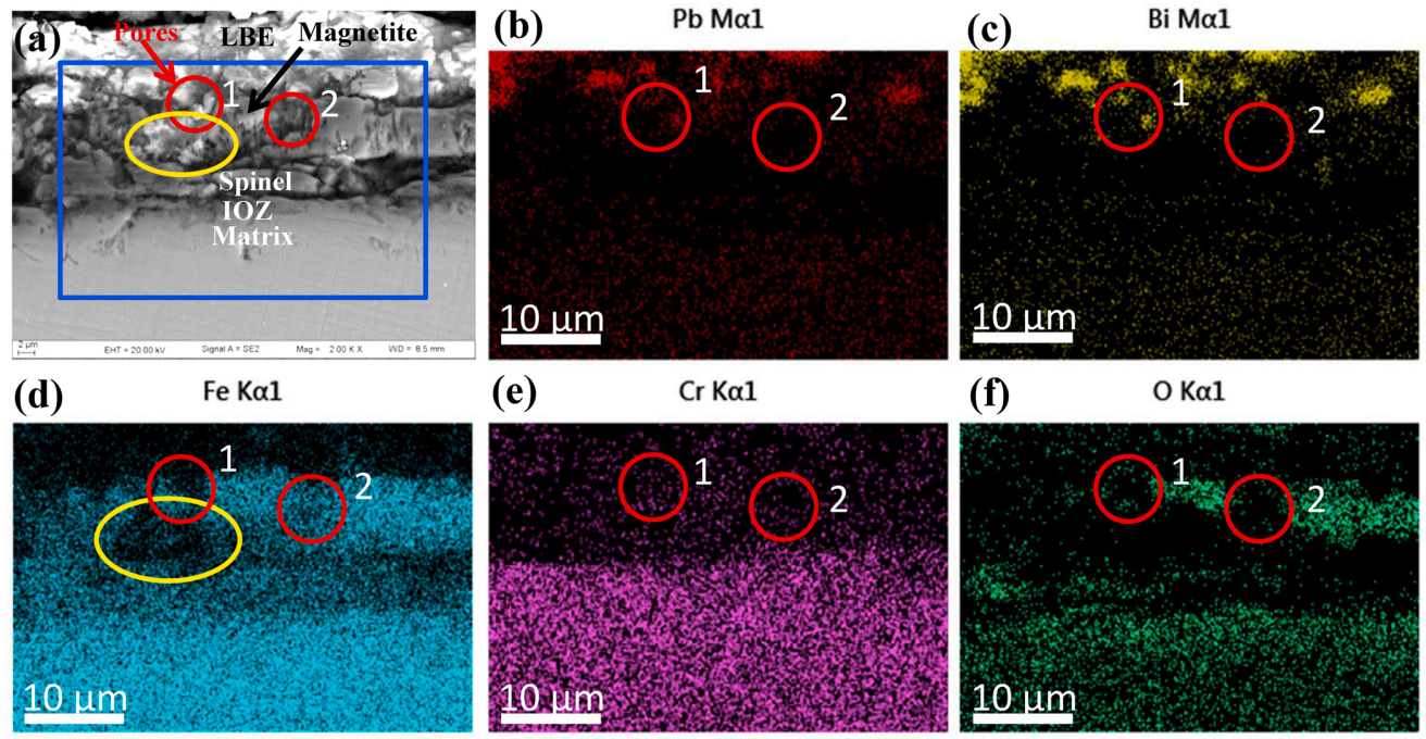 鐵素體/馬氏體鋼(鐵/馬鋼)是鉛冷快堆的重要候選結(jié)構(gòu)材料。當(dāng)溫度≥450℃,且氧濃度≥10-6wt%時,一般認為鐵/馬鋼在鉛鉍合金中會形成氧化膜,包括磁鐵礦層、尖晶石層和內(nèi)氧化層。近期研究發(fā)現(xiàn)鐵/馬鋼在鉛鉍中腐蝕后,氧化膜可能具有更復(fù)雜的亞結(jié)構(gòu)及元素分布特性,而這些復(fù)雜的亞結(jié)構(gòu)和元素分布可能是造成鐵/馬鋼發(fā)生點蝕的重要原因。