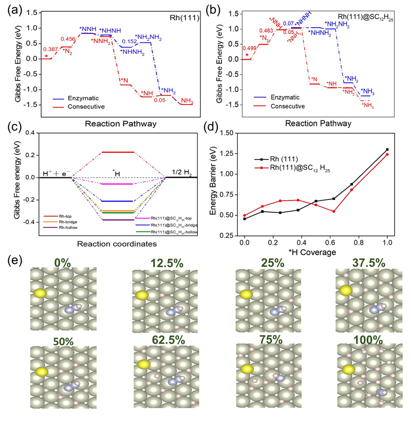 圖2. (a)Rh(111);(b)Rh(111)@SC12H25上NRR過程吉布斯自由能圖;(c)HER過程吉布斯自由能圖;(d)不同氫覆蓋度下N2加氫能壘;(e)氫覆蓋度示意圖。