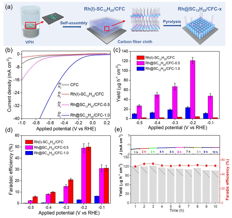 圖1. (a)Rh@SC12H25/CFC-x催化劑的制備示意圖。(b)Rh(I)-SC12H25/CFC、Rh@SC12H25/CFC-0.5、Rh@SC12H25/CFC-1.0、CFC電極分別在Ar和N2飽和的0.1 M Na2SO4溶液中的LSV曲線;Rh(I)-SC12H25/CFC、Rh@SC12H25/CFC-0.5、Rh@SC12H25/CFC-1.0電極在不同電位下氨生成(c)產(chǎn)率;(d)法拉第效率;(e)Rh@SC12H25/CFC-0.5在-0.2 V過電位下循環(huán)反應(yīng)10次對應(yīng)的產(chǎn)率、法拉第效率、陰極電流。