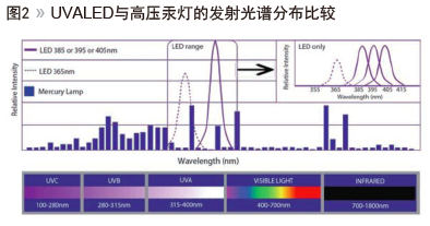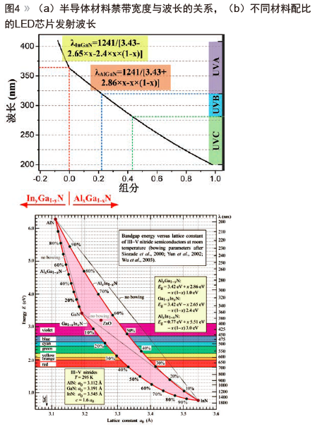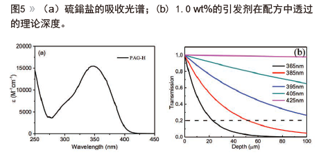 光引發(fā)劑(Photoinitiator,PI)是光固化反應(yīng)和光固化產(chǎn)品中最重要的組成部分。圖1就是工業(yè)化中最常用的一些光引發(fā)劑的分子結(jié)構(gòu),包括自由基型光引發(fā)劑(分為光裂解Type I型,例如1173、184和奪氫Type II型,例如BP、ITX)和陽(yáng)離子型光引發(fā)劑(最后兩 種碘鎓鹽和硫鎓鹽)。 從上述光引發(fā)劑的分子結(jié)構(gòu)可以看出,分子的主要的吸光基團(tuán)就是苯環(huán),這就決定了這些光引發(fā)劑分子的最大吸收波長(zhǎng)基本上處于UVB區(qū)域(280-320nm,圖2),以油墨領(lǐng)域廣泛使用的907為例,如圖3所示。從圖中可以看出,光引發(fā)劑907在乙腈溶劑中的最大吸收峰的波長(zhǎng)位于304nm(吸收峰與溶劑相關(guān),在具體配方中會(huì)發(fā)生移動(dòng)),最大摩爾消光系數(shù)ε304nm~18000 L Mol-1 cm-1,可以說(shuō),在這個(gè)波段的吸收是非常強(qiáng)的。以907為代表的這類傳統(tǒng)的光引發(fā)劑,其開發(fā)的時(shí)代背景是激發(fā)光源為高壓汞燈,高壓汞燈的發(fā)射光譜在302nm有一個(gè)非常強(qiáng)的發(fā)生峰(圖2),所以在汞燈激發(fā)下,907這類光引發(fā)劑習(xí)慣效率非常高,是一類非常高效的光引發(fā)劑,迄今在光固化油墨等領(lǐng)域有很大的用量。然而,在進(jìn)入U(xiǎn)V-LED時(shí)代的時(shí)候,我們卻發(fā)現(xiàn)很多類似907這類傳統(tǒng)的常用光引發(fā)劑的使用卻受到了很大的制約,究其原因,是因?yàn)長(zhǎng)ED的發(fā)射波長(zhǎng)和汞燈的發(fā)射波長(zhǎng)有很大的不同,而我們觀測(cè)907在UVALED波段的吸收時(shí),發(fā)現(xiàn)其吸光度是非常小的,例如其ε365nm~100 L Mol-1 cm-1。 我們知道,當(dāng)前工業(yè)化應(yīng)用相對(duì)成熟的UVLED光源的發(fā)射光譜主要位于UVA波段并且偏長(zhǎng)波的區(qū)域, 即365-405nm,很明顯,傳統(tǒng)的光引發(fā)劑大多數(shù)與LED光源的發(fā)射光譜是嚴(yán)重不匹配的,實(shí)際上,除了TPO、819、ITX等幾種引發(fā)劑在該區(qū)域有較好的吸收之外,其余引發(fā)劑在UVA波段的吸收都是很小的。這點(diǎn)可以從圖3(右)中得到很好的解釋。 那么是否可以做出跟傳統(tǒng)光引發(fā)劑的吸收波長(zhǎng)相匹配的LED光源呢?從理論上說(shuō),什么波長(zhǎng)的LED光源都是可以做出來(lái)的,如圖4所示,改變半導(dǎo)體材料的配比,就可以制造出不同發(fā)射波長(zhǎng)的LED芯片來(lái)。 拋開最難的芯片的制造不談,單從UVLED光源來(lái)說(shuō),就涉及到芯片的規(guī)格選擇、芯片的封裝方式、系統(tǒng)的光學(xué)設(shè)計(jì)、電源系統(tǒng)的選擇、散熱系統(tǒng)的方案設(shè)計(jì)等等,任何一個(gè)環(huán)節(jié)做得不好,都會(huì)影響到整個(gè)系統(tǒng)的穩(wěn)定性和可靠性。所以雖然理論上什么波長(zhǎng)的LED光源都可以做,但是能夠真正產(chǎn)業(yè)化應(yīng)用的卻很有限。 由于LED的發(fā)射光譜較窄,半峰寬(60%的發(fā)光功率)一般在10nm以內(nèi)。以365nm和395nmLED為例,我們發(fā)現(xiàn)與907的吸收光譜重疊非常小,這就導(dǎo)致光引發(fā)劑的吸收光譜和LED發(fā)射光譜重疊積分很弱,那么光源的能量大部分都浪費(fèi)掉了,并不能用于引發(fā)光化學(xué)反應(yīng)。然而,實(shí)際光聚合效果證明,這些光引發(fā)劑在用LED為光源的時(shí)候,是可以有效地引發(fā)聚合的。因此,我們必須考慮配方中的其它因素。內(nèi)因和外因需要綜合考慮。 這是因?yàn)楣夤袒且粋€(gè)從配方到光源相互作用的復(fù)雜體系,摩爾消光系數(shù)只是影響配方吸光能力的一個(gè)因素。還有光強(qiáng)、漆膜厚度和引發(fā)劑濃度的因素也必須考慮。一個(gè)配方涂成薄膜之后,其吸光度(A)符合朗格-比爾定律: 其中,ε是與波長(zhǎng)有關(guān)的摩爾消光系數(shù),如圖1所示,在不同波長(zhǎng)處是不同的。一般來(lái)說(shuō),當(dāng)ε的數(shù)值大于100L Mol-1cm-1,光引發(fā)劑就有使用價(jià)值,如907在365nm處的摩爾消光系數(shù)就處于這個(gè)范圍。一類特殊的可見(jiàn)光光引發(fā)劑樟腦醌(CQ),其在可見(jiàn)光區(qū)域的值只有29 L Mol-1光固化等領(lǐng)域應(yīng)用效果非常理想。其原因在于后面的兩個(gè)參數(shù)。這里c就是摩爾濃度,在實(shí)際配方中,一般用質(zhì)量濃度來(lái)使用,一般的光引發(fā)劑的質(zhì)量含量為2%~6%,一般不超過(guò)8%~10%,以清漆類配方為例,稀釋劑和樹脂的密度假設(shè)為1g/mL,c約為0.067~0.33mol/L,這是相當(dāng)高的數(shù)值,在圖2的乙腈溶劑中,c約為10-4 mol/L,因此配方中的濃度是100-1000倍,因此,在UVA階段的吸收會(huì)明顯增高;l在公式里面就是薄膜的厚度,單位是cm。實(shí)際應(yīng)用的涂層的厚度是微米級(jí),一般5~50μm范圍。這樣配方的吸光度A可以通過(guò)公式計(jì)算得到,約為0.02~2.0。配方薄膜吸收光的比例可以通過(guò)A值計(jì)算出來(lái): 根據(jù)公式(2),代入A = 0.02~2.0,可以計(jì)算出在吸光度范圍內(nèi),薄膜吸收光的比例約為5%~99%。當(dāng)配方涂膜只有5微米厚時(shí),引發(fā)劑的濃度即便增加到10wt%,也只有5%的光被利用,95%不起作用(可以通過(guò)LED設(shè)備光路設(shè)計(jì)反射等再次利用,這是實(shí)際問(wèn)題,不包括在此理論計(jì)算過(guò)程內(nèi))。當(dāng)引發(fā)劑濃度過(guò)大或者膜較厚時(shí),那么上層配方即可