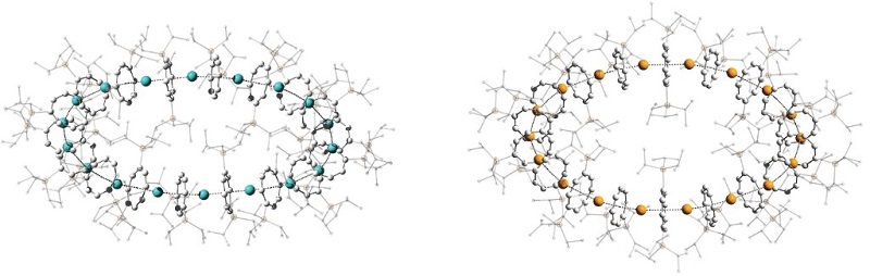 日本沖繩科學(xué)技術(shù)研究所與德國和俄羅斯的科學(xué)家攜手,通過將18個(gè)茂金屬單元彎曲成一個(gè)納米級的環(huán),制成了一種新型的超大夾層復(fù)合物環(huán)烯。他們將金屬鍶、釤或銪等夾在環(huán)辛四烯層之間,龐大的三異丙基甲硅烷取代基迫使茂金屬在堆疊時(shí)彎曲成環(huán),制成了這些環(huán)烯。