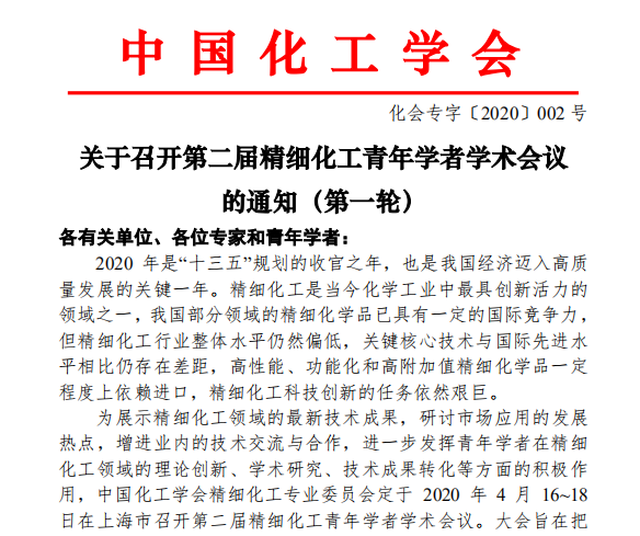 為展示精細化工領域的最新技術成果,研討市場應用的發展熱點,增進業內的技術交流與合作,進一步發揮青年學者在精細化工領域的理論創新、學術研究、技術成果轉化等方面的積極作用,中國化工學會精細化工專業委員會定...