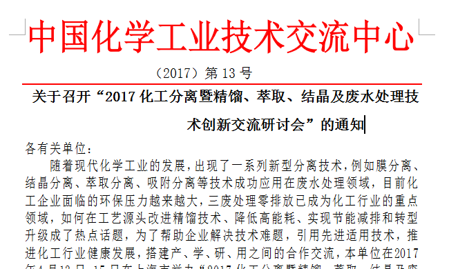 2017年4月13日-15日在上海市舉辦“2017化工分離暨精餾、萃取、結晶及廢水處理技術創新交流研討會”,會議分兩個會場同時召開,同時歡迎高校、科研院所和企業發言,此次大會為企業與院校及科研院所搭建...