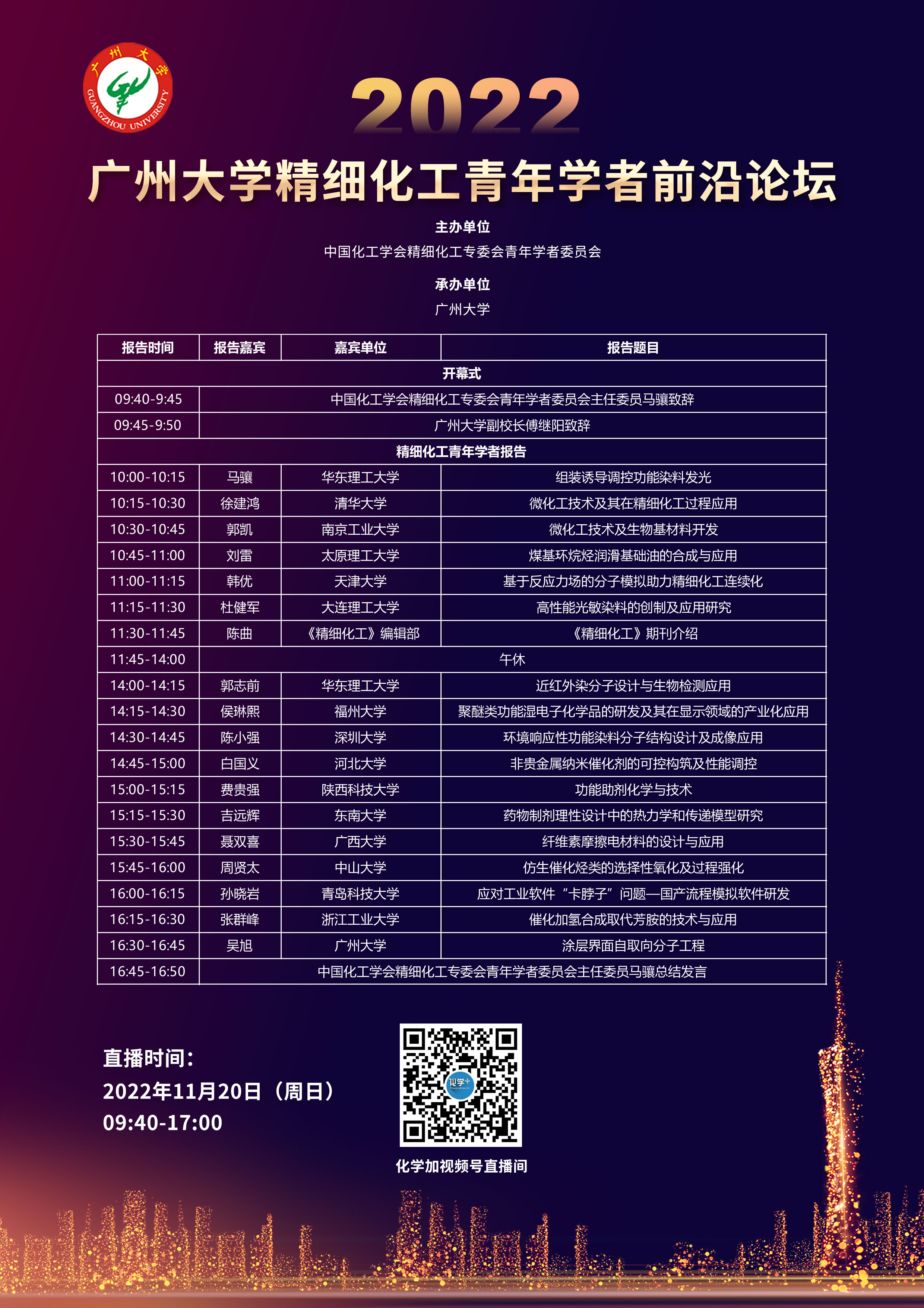 2022年11月20日召開(kāi)“2022廣州大學(xué)精細(xì)化工青年學(xué)者前沿論壇”,化學(xué)加全程直播。...
