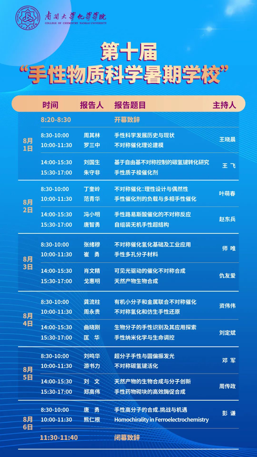 2022年第十屆手性物質(zhì)科學(xué)暑期學(xué)校將于2022年8月1日至8月6日在天津舉行,由中國(guó)化學(xué)會(huì)手性化學(xué)專業(yè)委員會(huì)和天津化學(xué)化工協(xié)同創(chuàng)新中心手性物質(zhì)創(chuàng)造與轉(zhuǎn)化平臺(tái)主辦,南開(kāi)大學(xué)化學(xué)學(xué)院承辦。...