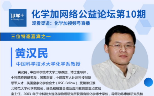 化學加網絡公益論壇第10期將于2022年7月2日(星期六)14:00-16:30舉行,我們很高興邀請到了中國科學技術大學化學系黃漢民教授、浙江大學化學系史炳鋒教授、南京大學化學化工學院史壯志教授三位嘉...
