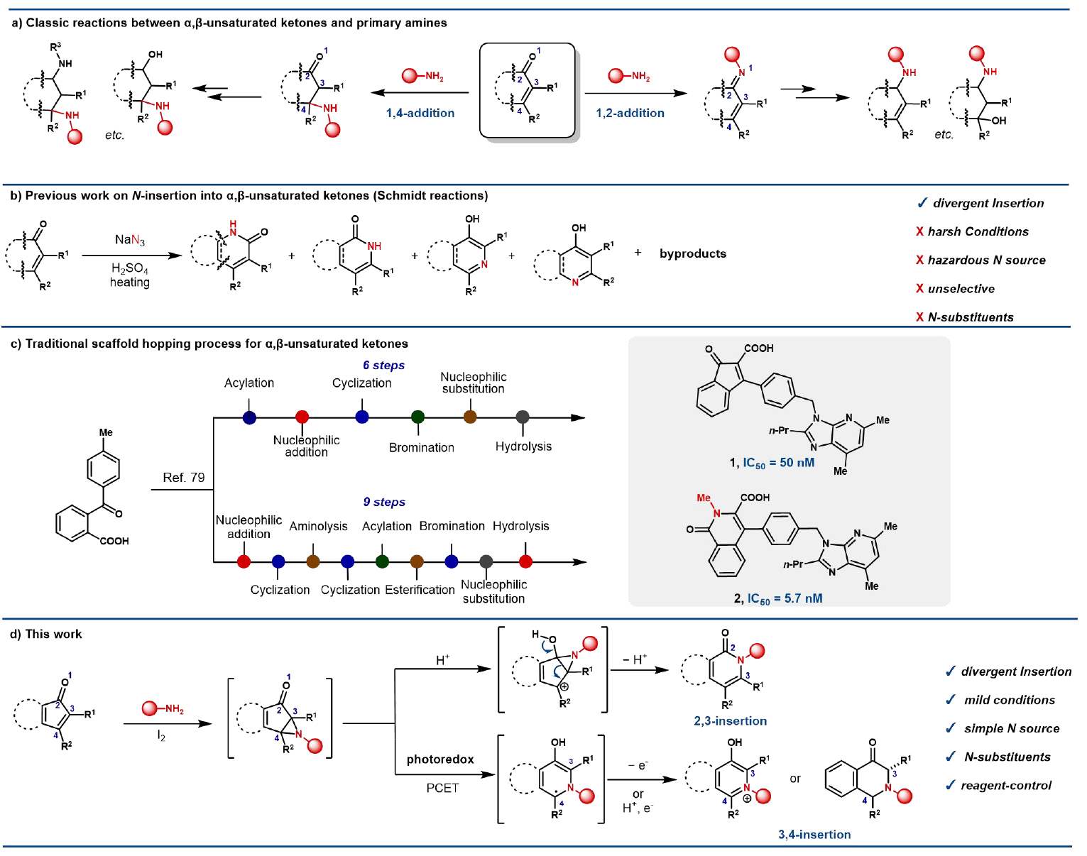 α,β- 不飽和酮作為藥物分子與天然產物中的關鍵結構單元,其化學轉化長期受限于外圍修飾(如 1,2 - 或 1,4 - 加成),而骨架層面的氮原子插入則依賴傳統 Schmidt 反應 —— 該反應需使...
