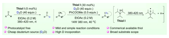 氘代化合物在藥物研發、材料科學及機理研究中具有不可替代的價值。因此,開發出一種操作簡單、成本價廉且高效的合成方法深受研究學者們的青睞。近日,鄭州大學的張月騰和王志遠團隊合作通過380-420nm光照激...