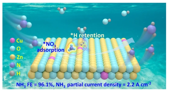 本研究中設計了一種Cu1/ZnO單原子合金氧化物(SAAO)催化劑。該催化劑體系中,原子級分散的Cu位點增強了對吸附態硝酸根(*NO3)的吸附能力,并且Cu位點協同ZnO載體中Zn位點促進了水解離生成...