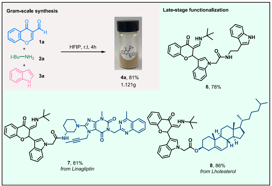 針對黃酮類化合物在藥物合成中的重要價值,重慶文理學院唐子貽和劉新悅依托省部級大學生創新創業項目加入陳中祝、雷杰課題組后,結合前期累積的實驗技能,在指導老師的幫助下充分利用課余時間,發展了以色酮-3-甲...