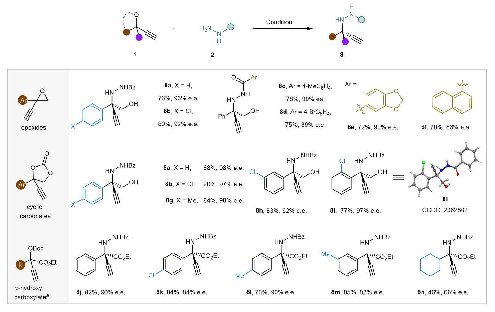華東師大周劍和周鋒教授團隊基于所發展的兼具大位阻功能基和手性傳導基的空間受限PYBOX配體,實現了高底物普適性和高對映選擇性的簡單酮衍生炔丙醇酯的不對稱炔丙基肼化反應,為α-季碳手性肼類化合物的合成提...