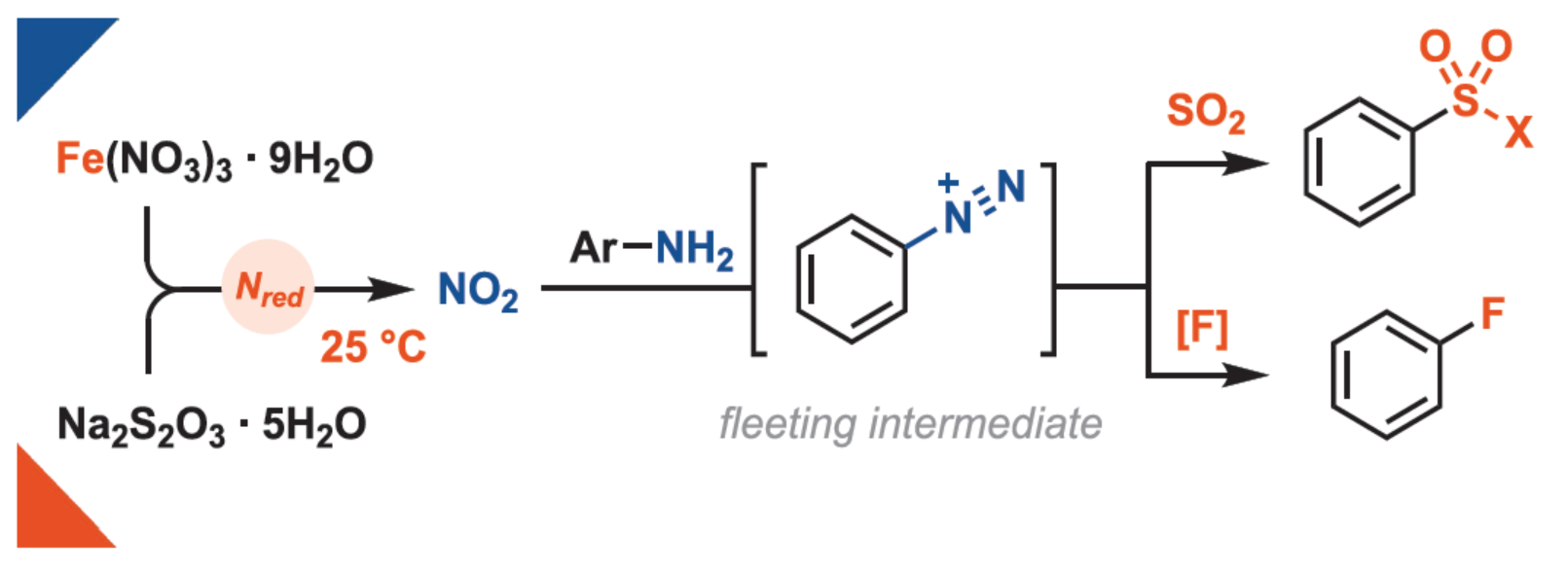 近日,德國馬克斯·普朗克研究所Tobias Ritter課題組報道了一種基于常溫下硝酸鐵還原原位生成重氮鹽的方法,實現了苯胺的直接脫氨基氯磺酰化(chlorosulfonylation)和氟化反應,涉...