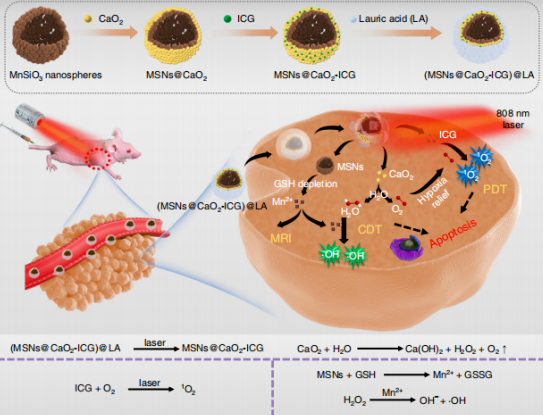 北京科技大學張學記教授團隊和董海峰教授團隊聯合設計了一種熱響應H2O2/O2自供納米系統(MSNs@CaO2-ICG)@LA用于PDT/CDT 協同抗腫瘤治療,克服了PDT/CDT 協同治療中O2和H...