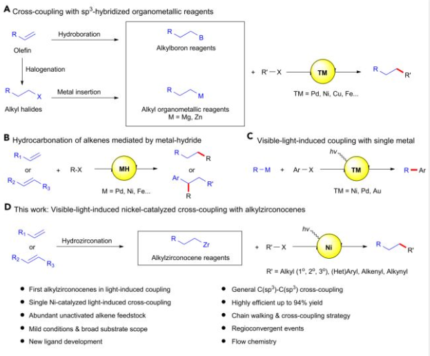 近期,北京生命科學研究所齊湘兵課題組與南京理工大學姜超課題組合作報道了可見光引發、單一鎳催化的烷基鋯的交叉偶聯反應,可用于C(sp3)-C(sp3), C(sp3)-C(sp2)和C(sp3)-C(s...