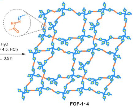 近日,復旦大學黎占亭教授、周偉副教授、張運昌團隊以半剛性四陽離子四醛和四個柔性二酰肼為原料,合成了四種水溶性腙基三維柔性有機框架FOF-1-4。1H NMR譜圖顯示了重水中FOF-1-4的形成,動態光...
