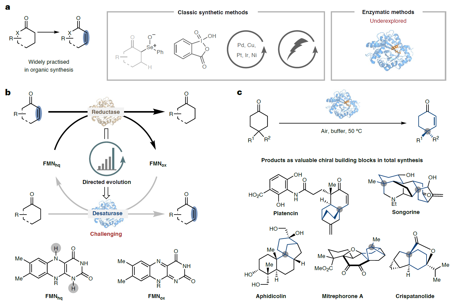 西湖大學(xué)葉宇軒課題組從一類底物范圍好、熱穩(wěn)定性高、易于表達(dá)的烯還原酶出發(fā),成功把其從還原酶改造成去飽和化酶 (圖1b),建立了一個(gè)通用的酶催化羰基去飽和化反應(yīng)平臺(tái),合成了一系列含有遠(yuǎn)端四級手性中心的高...