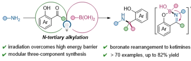 α-叔胺作為藥物分子和生物活性分子的重要骨架,其合成一直是合成化學(xué)研究的熱點(diǎn)。傳統(tǒng)的N-叔烷基化反應(yīng)往往受到底物空間位阻大、反應(yīng)活化能壘高等因素的限制。為了解決這些問題,中國科學(xué)院上海有機(jī)化學(xué)研究所陳...
