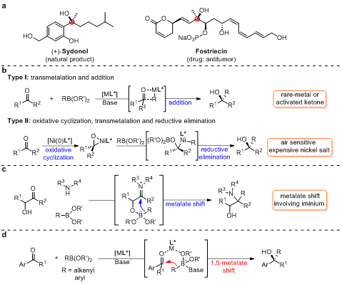 本文報道了通過豐產(chǎn)金屬鎳催化有機硼酸1,5-遷移策略實現(xiàn)芳基酮的不對稱烯基化和芳基化反應,高效的合成了一系列手性三級烯丙醇和二芳基醇,并且該方法可用于藥物的后期修飾以及天然產(chǎn)物的合成中。機理實驗結(jié)果表...