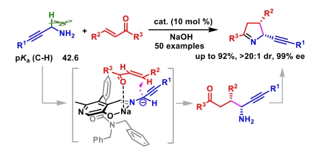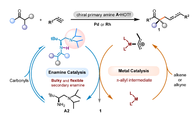 由于炔丙基胺的α C-H鍵的酸度低和NH2基團的親核干擾,炔丙基胺與α,β-不飽和酮的直接不對稱α-C-H共軛加成仍然是一個巨大的挑戰。上海師范大學趙寶國教授與陳雯雯教授團隊基于羰基催化的策略,發展了...