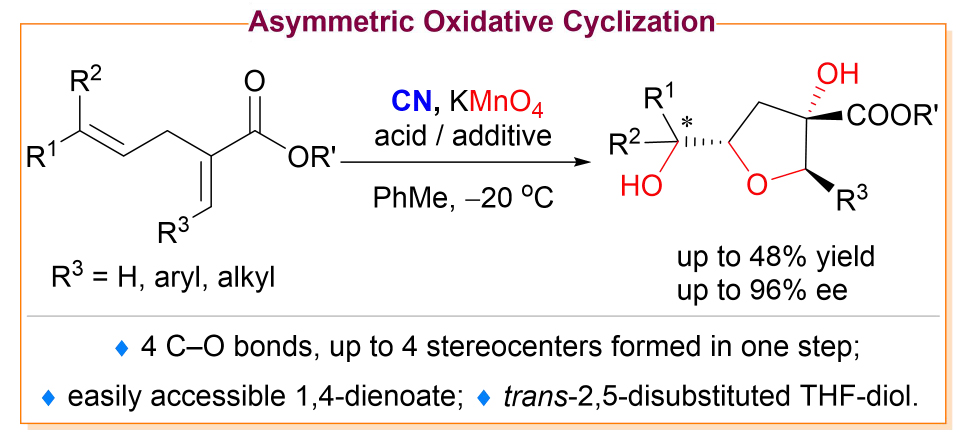 四氫呋喃結構單元在海洋天然產物和具有重要藥用價值的分子中廣泛存在。近日,南京工業大學/華僑大學王超團隊報道了一種多手性中心四氫呋喃結構的高效合成方法:以高錳酸鉀為氧化劑,金雞納堿季銨鹽為手性相轉移催化...