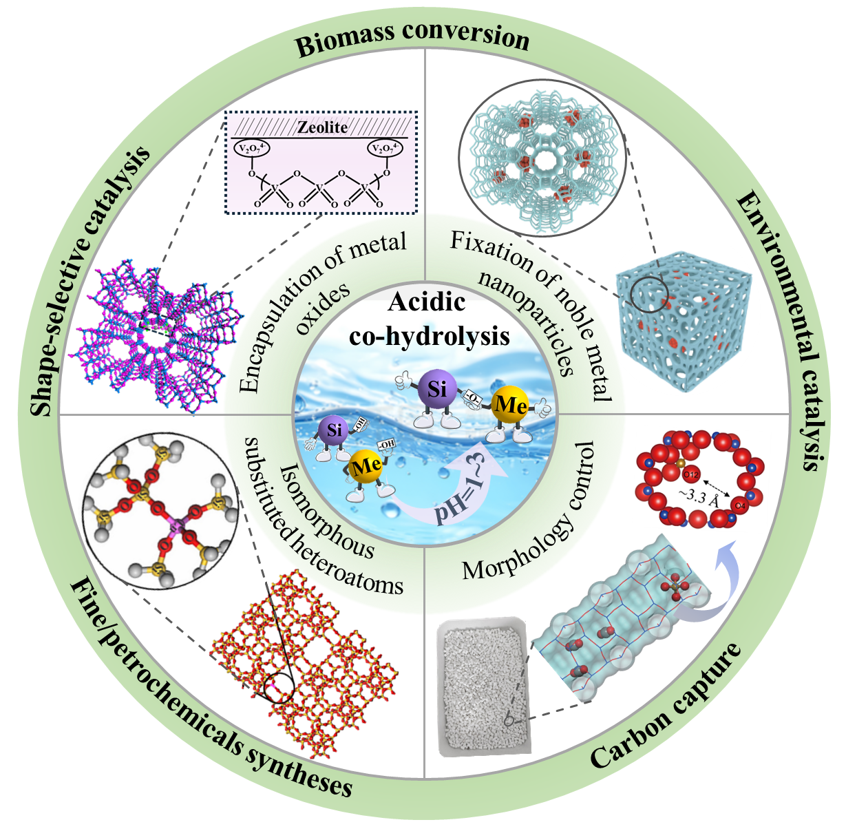 開發了一種獨特的酸水解策略(ACH):在弱酸條件下,金屬與硅源前驅體經過緩慢水解、縮合生成Me-O-Si單元,再調pH值至堿性形成沸石凝膠,晶化制備得到Me-沸石。該方法匹配金屬和硅源的水解速率,有效...
