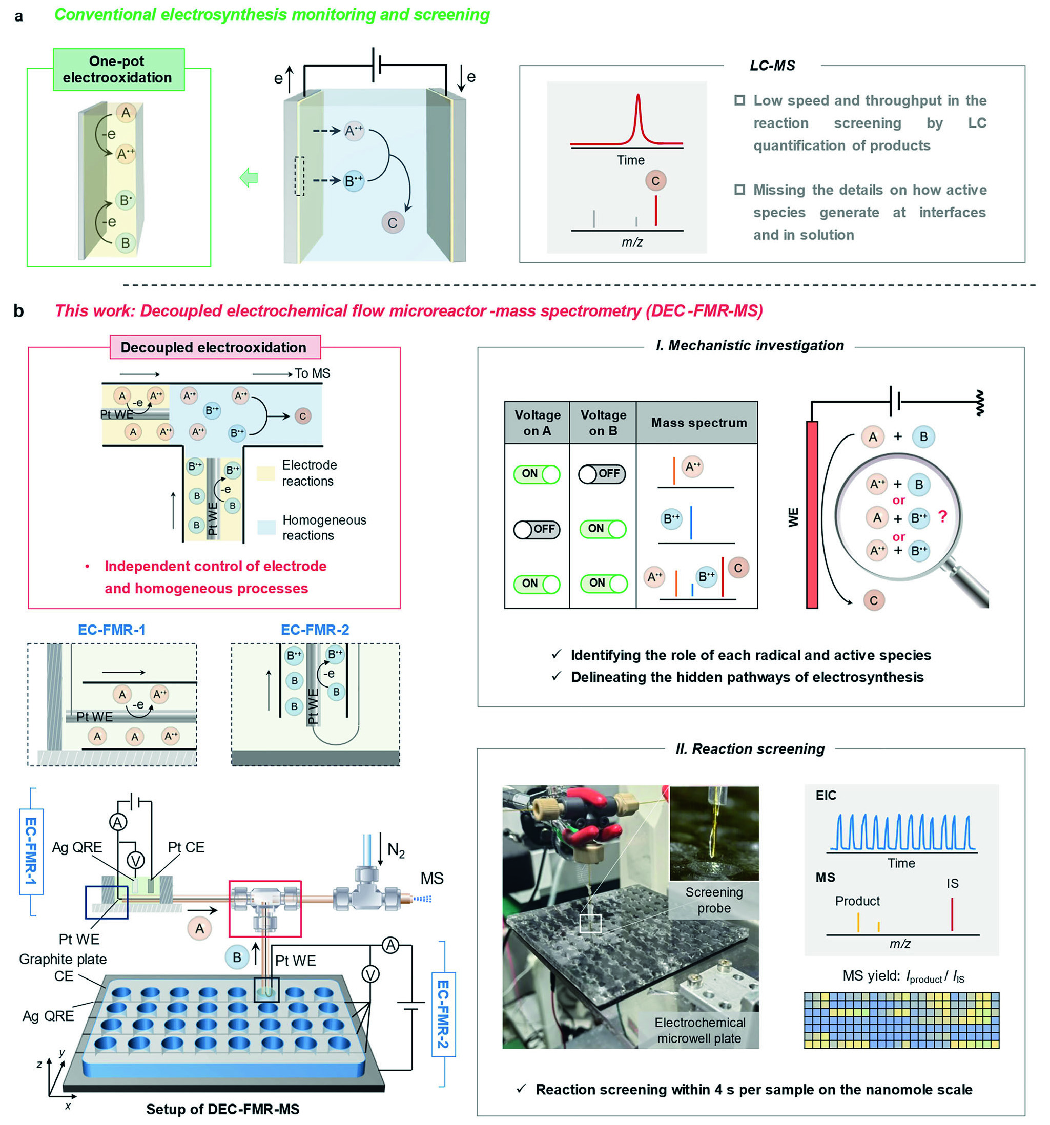 近日,南京大學閔乾昊團隊與程旭團隊合作開發了一種解耦式電化學流動反應器-原位質譜分析平臺(DEC-FMR-MS),實現了有機電合成反應的快速篩選與多步反應中間體的拆解剖析。該工作在Nature Com...
