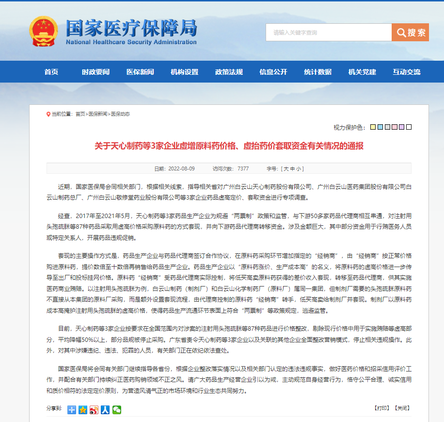 近期,國家醫(yī)保局會(huì)同相關(guān)部門,根據(jù)相關(guān)線索,指導(dǎo)相關(guān)省對(duì)廣州白云山天心制藥股份有限公司、廣州白云山醫(yī)藥集團(tuán)股份有限公司白云山制藥總廠、廣州白云山敬修堂藥業(yè)股份有限公司等3家企業(yè)藥品虛高定價(jià)、套取資金進(jìn)...