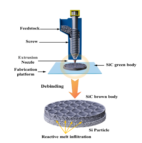 近日,中國科學院上海硅酸鹽研究所黃政仁研究員團隊陳健副研究員首次提出高溫熔融沉積結合反應燒結制備SiC陶瓷新方法。在3D打印碳化硅陶瓷研究中取得新進展,相關研究成果發表在Additive Manufa...