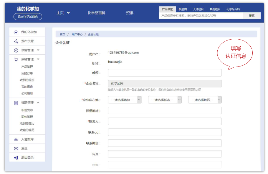 填寫完成后,點擊“提交認證”按鈕,化學加網工作人員會在1個工作日內完成審核工作。