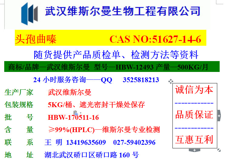頭孢曲嗪 維斯爾曼品牌科研高純試劑 51627-14-6