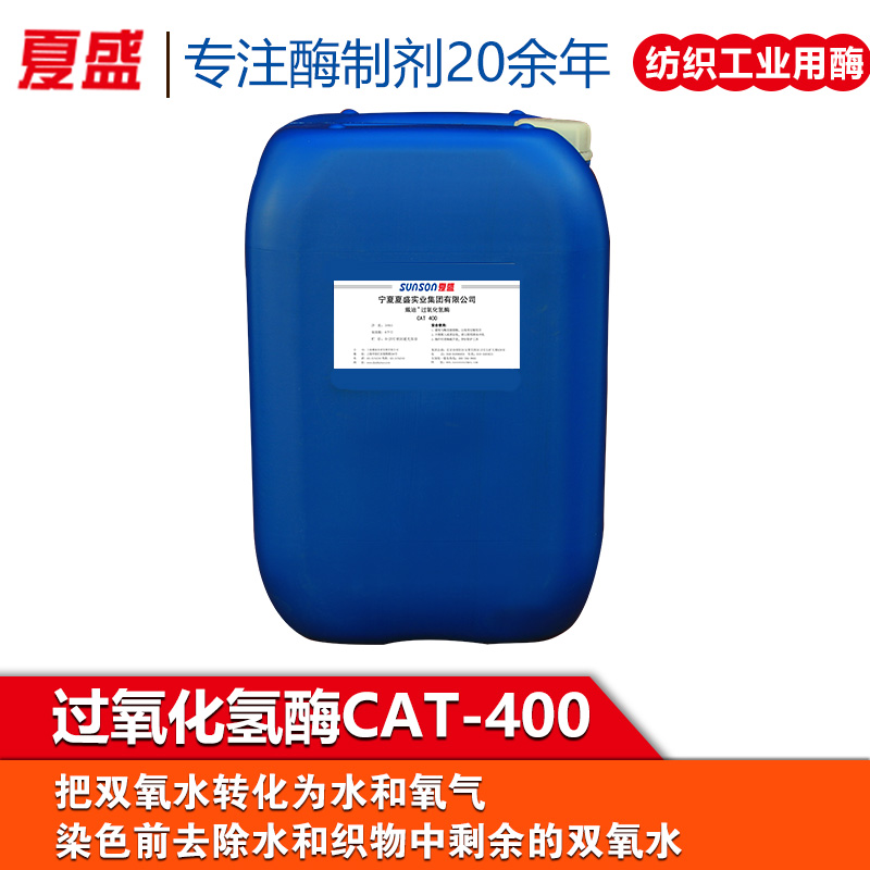 過氧化氫酶CAT-400是高濃度的工業級的過氧化氫液體酶,是由經基因改性的、自克隆的黑曲霉發酵生產。能有效地催化殘留過氧化氫,使之轉化為氧和水。該酶專一性的對過氧化氫起作用,而不會和染料發生反應。