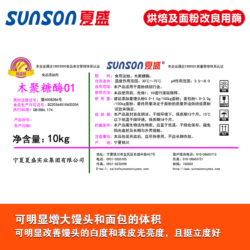 建議添加量:饅頭粉0.5-1.0g/100kg面粉,即(5-10ppm);面包粉1.0-3.0g/100kg面粉,即(10-30ppm)。最佳用量決定于面粉的質(zhì)量,最終由烘焙或蒸制試驗來確定。添加過量會導致面團持水力下降而發(fā)黏。