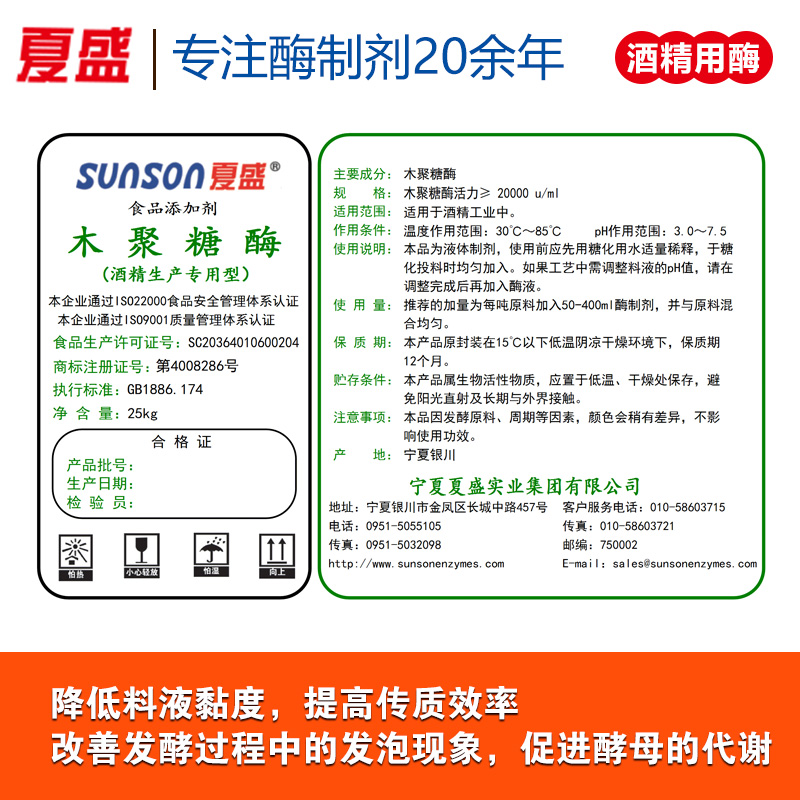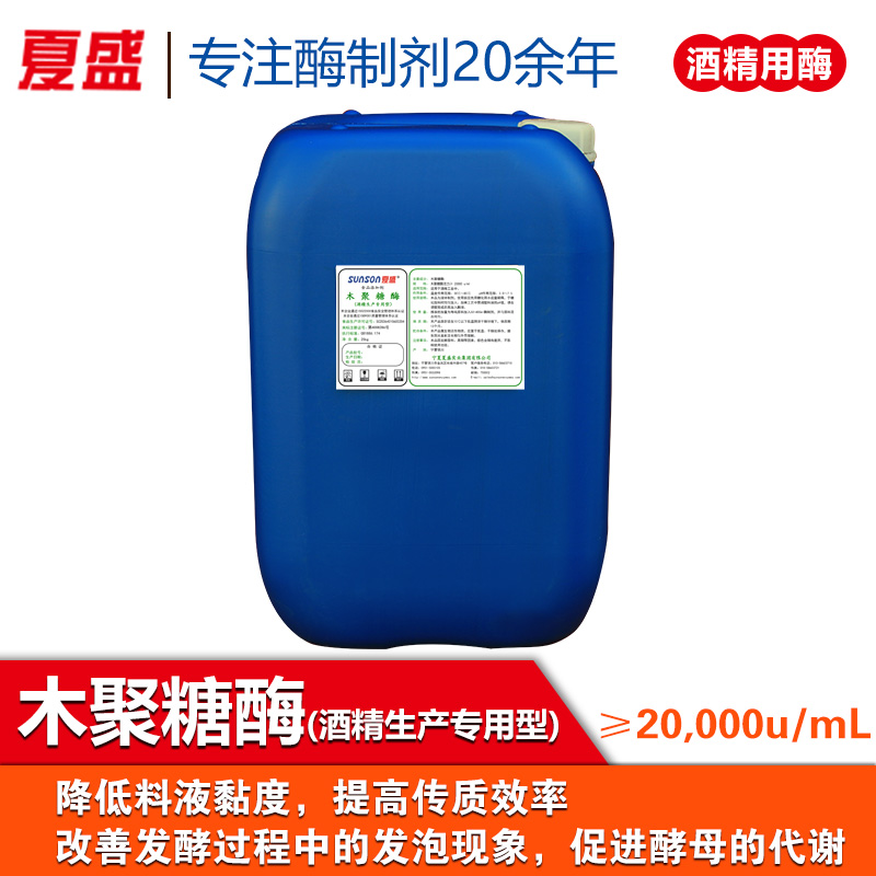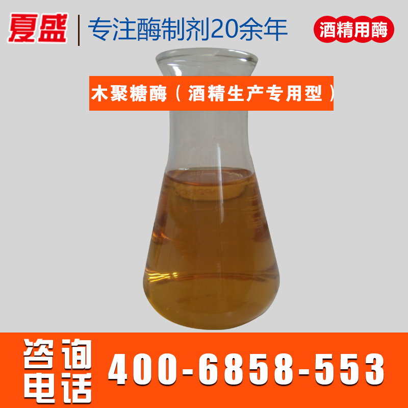 夏盛木聚糖酶(酒精生產專用型)是采用李氏木霉(Trichoderma reesei)經液體深層發酵、超濾等工序精制而成。木聚糖酶主要包括內切β-1,4木聚糖酶和β-木糖苷酶。內切β-1,4木聚糖酶以內切方式作用于木聚糖主鏈內部的β-1,4木糖苷鍵,產生低聚木糖,β-木糖苷酶水解低聚木糖和木二糖產生木糖。木聚糖酶的添加可以將造成料液粘稠的半纖維素類物質有效水解,廣泛應用于酒精工業中,尤其適用于以小麥淀粉為原料的酒精生產中。