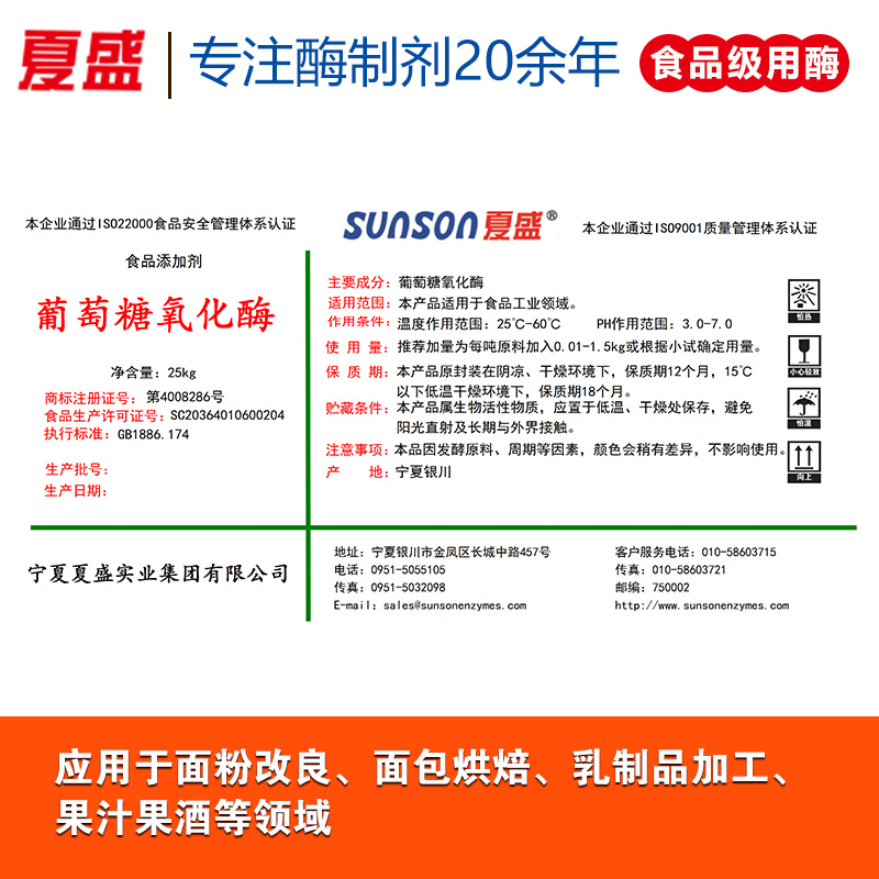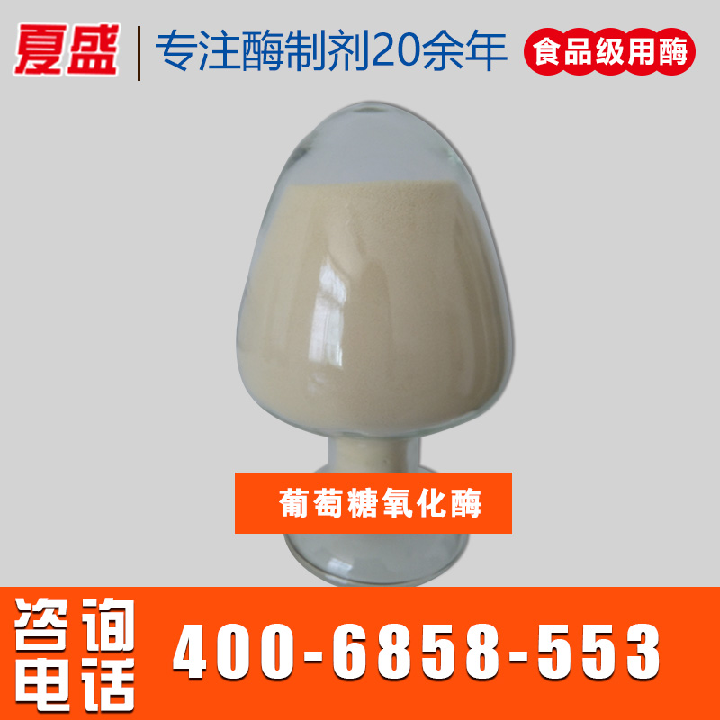 葡萄糖氧化酶(EC 1.1.3.4)以黑曲霉(Aspergillus niger)為生產菌種,經液體深層發酵精制而成。該酶是一種氧化還原酶,在分子氧的存在下,專一地氧化β-D-葡萄糖生成 D-葡萄糖酸內酯,同時消耗氧,生成過氧化氫,葡萄糖酸內酯進一步生成葡萄糖酸。本產品可廣泛應用于食品工業領域。
