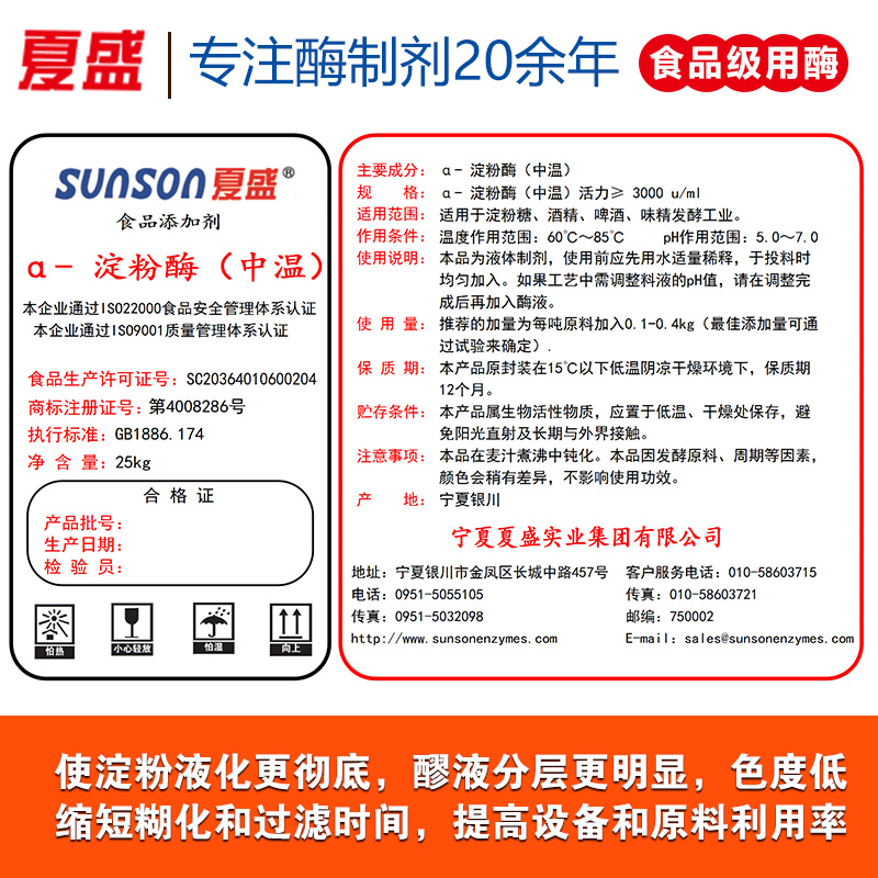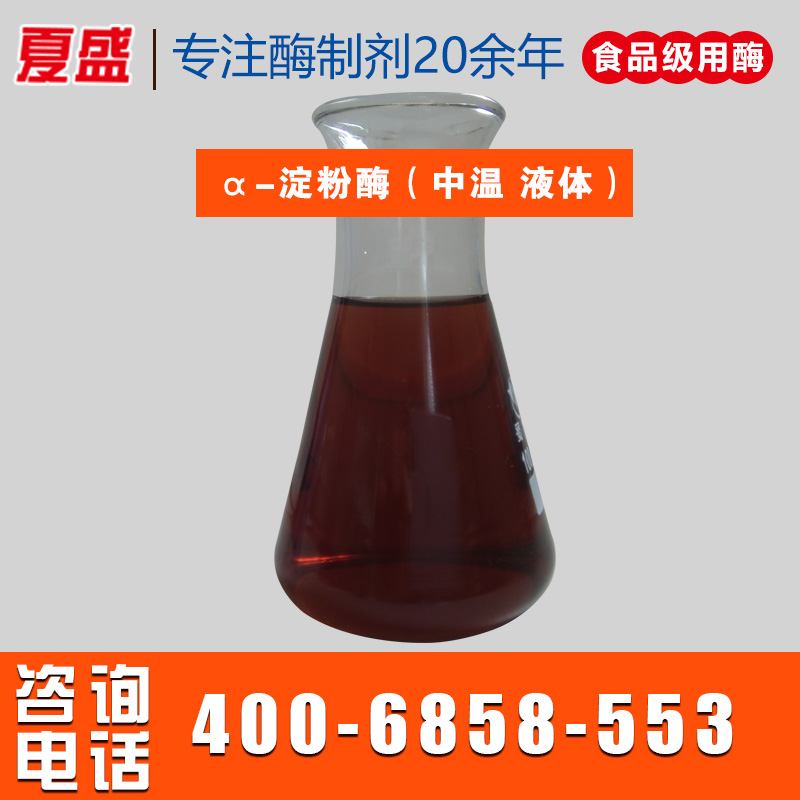 夏盛α-淀粉酶(中溫)是采用優良菌株枯草芽孢桿菌(Bacillus subtilis)經液體深層發酵、精制而成的高效生物酶制劑,它能有效地水解淀粉、糖原及其降解物內部的α-1.4葡萄糖苷鍵,產生可溶性糊精和少量低聚糖,使得膠狀淀粉溶液的粘度迅速下降。