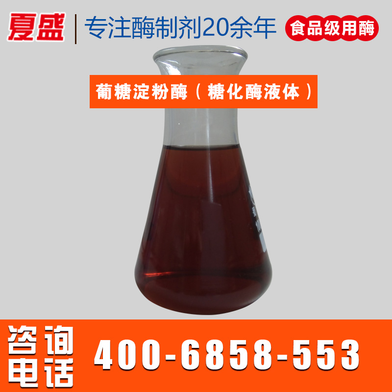 夏盛葡糖淀粉酶是采用黑曲霉(Aspergillus niger)經液體深層發酵、超濾等工序精制而成。它以淀粉為底物,在一定條件下從淀粉的非還原性末端開始依次水解α-1,4葡萄糖苷鍵產生葡萄糖,也能緩慢水解α-1,6葡萄糖苷鍵產生直鏈多糖??蓮V泛應用于酒精工業、黃酒、白酒和食醋等釀造工業中。