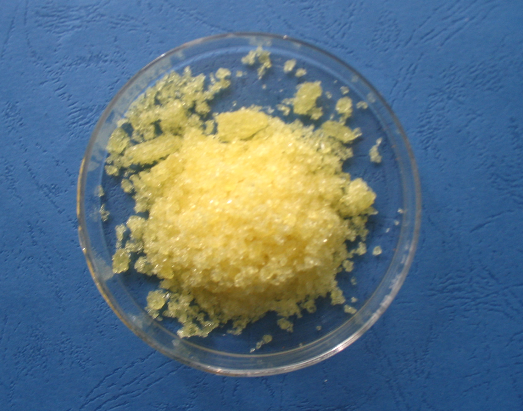 外觀性狀:黃色結晶體或粉末,溶于水和乙醇,有潮解性,密閉保存。