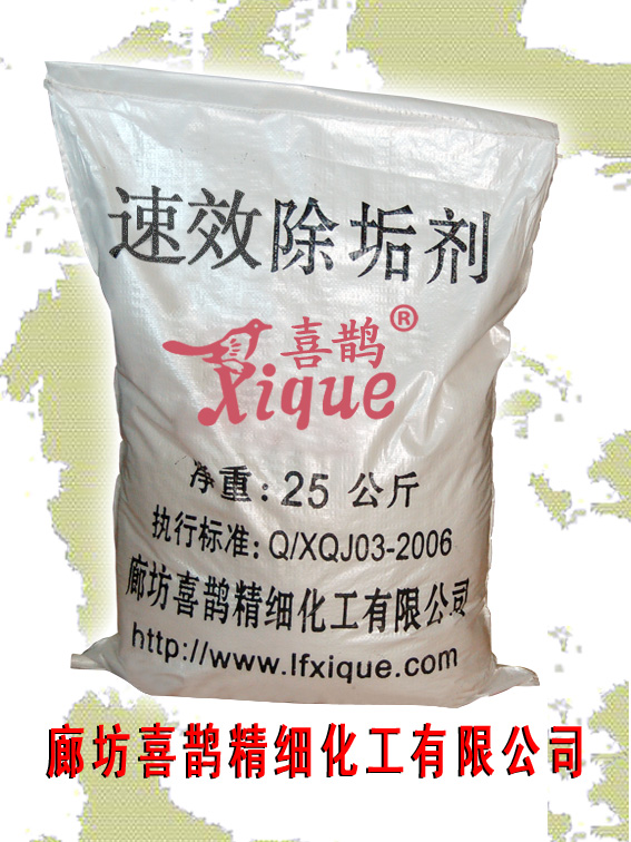 本品外觀為微黃或白色粉沫兩種藥劑,其除垢性能遠遠高于有機酸,它可以清除碳鹽、硫酸鹽、氧化鐵、硅酸鹽等多種污垢,本劑由XQ-901和XQ-826(獲國家科技進步二等獎、化工部科技進步一等獎,國家科委三等發明獎)及滲透劑,促進劑等多種成分復配而成,其中XQ-901和XQ-826兩種高效緩蝕劑,可適用于鍋爐鋼,不銹鋼、黃銅、紫銅等多種金屬及合金材質,緩蝕率達99.7%,比鹽酸類除垢劑要高幾十倍到幾百倍。