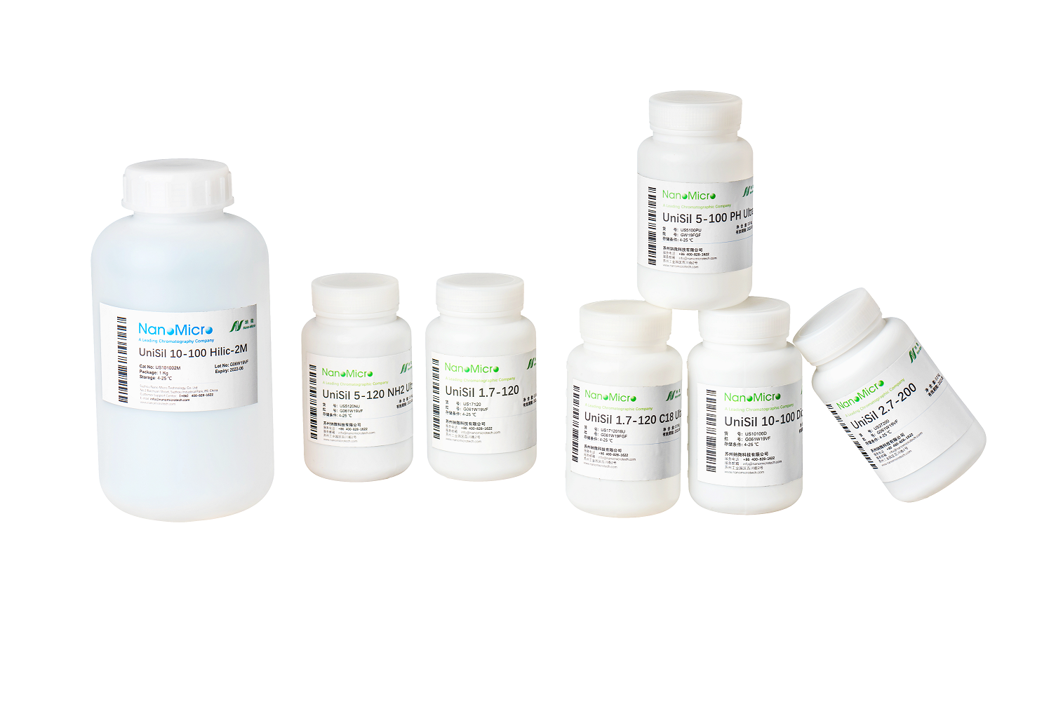 UniSil反相色譜填料是在納微生產的單分散多孔球形硅膠的基礎上,利用先進的表面鍵合和封端技術開發的系列產品。UniSil反相色譜填料由于鍵合密度高,封端良好,粒徑均一和機械強度高,因此具有化學穩定性好(耐pH范圍寬),壽命長,裝柱容易、柱效高、分辨率好、反壓低等特性。UniSil已廣泛應用于各種有機化合物、天然產物及生物大分子的色譜分析和工業分離純化。納微已成為全球大規模生產單分散硅膠色譜填料的領導者。
