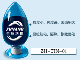 Product features: nano titanium nitride (TIN) is prepared by aerosol ablation, with high purity, small particle size, uniform distribution, large specific surface area, high surface activity, high nitrogen content, high temperature resistance, oxidation resistance, high hardness, excellent infrared absorption performance (over 80%), UV screen Covering more than 85%, it can be applied to thermal insulation coating and automobile ceramic film, and plays the role of heat insulation and temperature control. The material has good conductivity, which can be used as electrode and contact in molten salt electrolysis. It is very good for toughening ceramics and high temperature resistant structural ceramics.