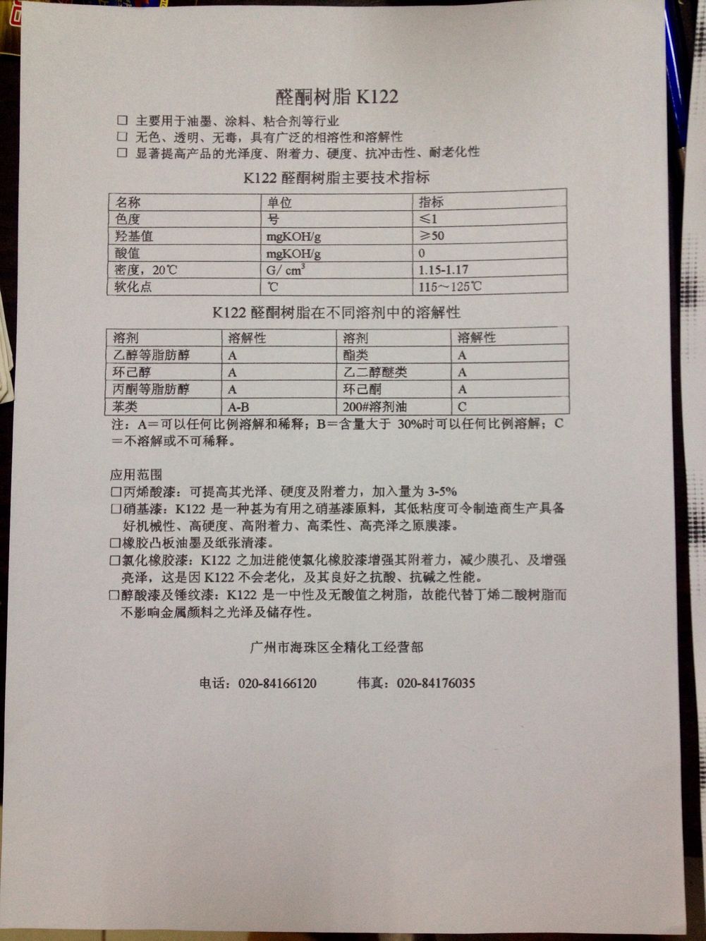 “硝基漆、凸版油墨用K122聚酮樹脂(**)醛酮樹脂”參數說明