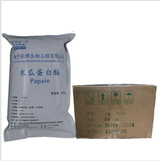 木瓜蛋白酶是采用生物工程技術從番木瓜植物未成熟的果實中提煉而得的純天然生物酶制品,它是由212個氨基酸組成,分子量為21000,屬于含巰基(SH)肽鏈內切酶,具有蛋白酶和酯酶的活性,有較廣泛的特異性,對動植物蛋白、多肽、酯、酰胺等有較強的酶解能力,同時還具有合成的能力,可把蛋白質水解物再合成蛋白質類物質,這種能力可用來改善動植物蛋白的營養價值或功能性質。