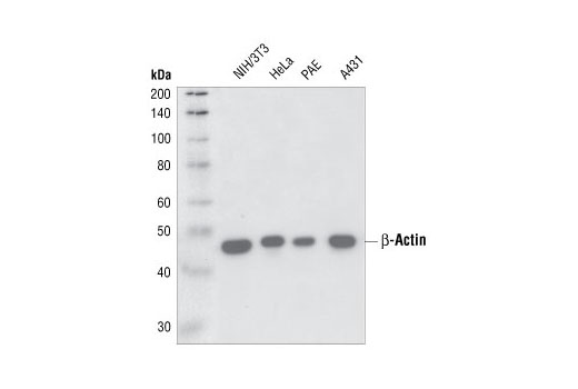 β-Actin (13E5) Rabbit mAb 可檢測總 β-肌動蛋白的內源水平。盡管細胞質肌動蛋白同工型、β 肌動蛋白和細胞質 γ 肌動蛋白之間有著高序列同源性,但 β-Actin (13E5) Rabbit mAb #4970 不會與細胞質 γ 肌動蛋白或任何其他肌動蛋白同工型發生交叉反應。