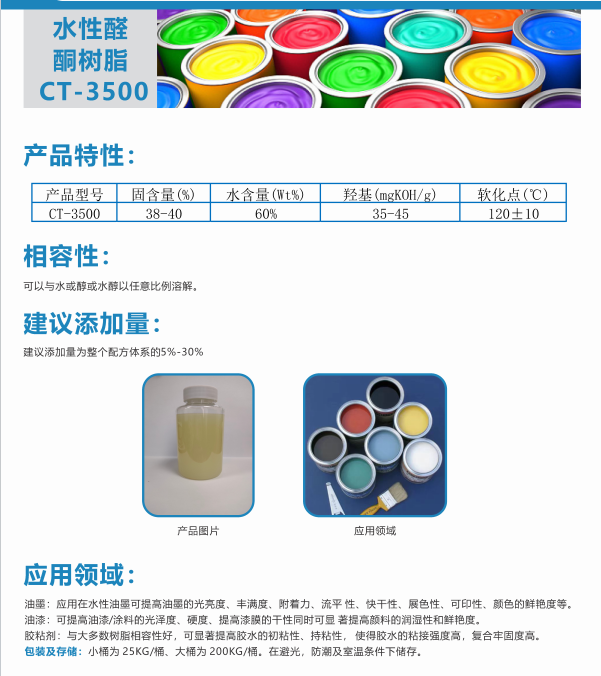 水性醛酮樹脂CT-3500可以溶于水或醇或水醇以任意比例溶解的水溶性醛酮樹脂 CT-3500