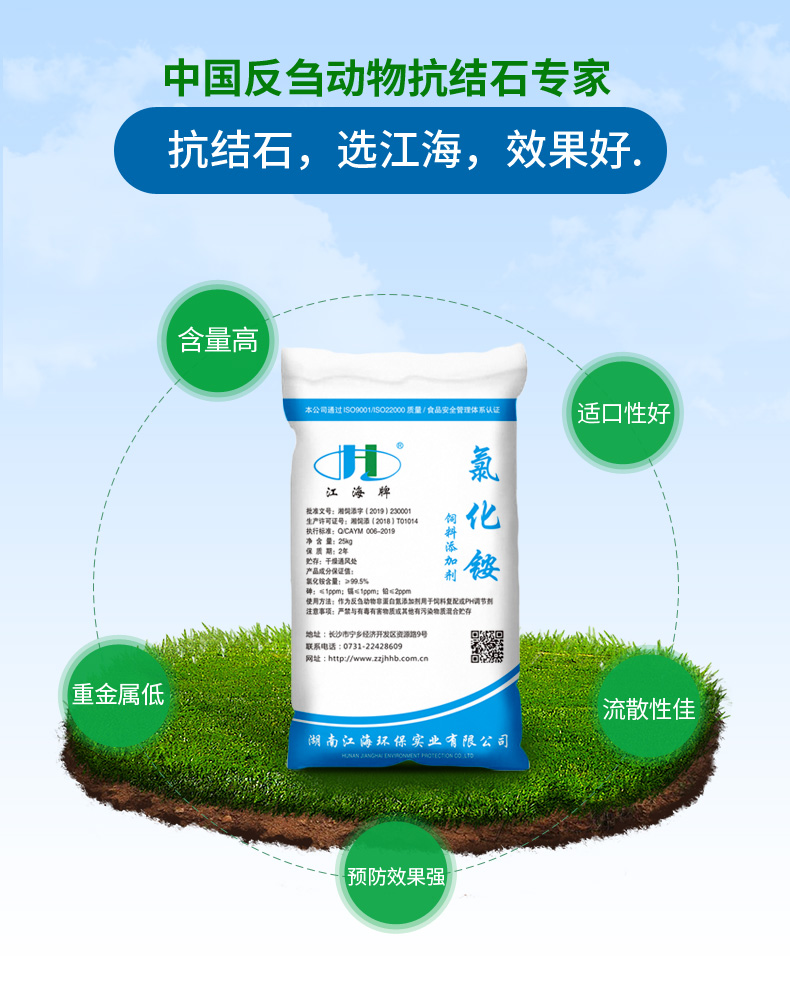 “湖南江海飼料級氯化銨”是以工業氯化銨作為原材料經過提純、去雜、去除硫根離子以及砷等重金屬離子,添加鐵、鈣、鋅等動物所需要的微量元素,能有效補充蛋白質營養。具有預防疾病、促進生長的作用。飼料級氯化銨中的氮通過一系列生物化學反應能將非蛋白氮合成微生物氮基酸,進而合成微生物蛋白質,以節省飼料蛋白質。國外將氯化銨作為銨鹽類非蛋白氮添加到牛羊等動物的飼料中,但是添加量都有嚴格的限制。和自然界含氮量最高的化合物尿素相比,氯化銨有其獨特的優勢。由于尿素味苦,直接飼喂困難,而飼料級氯化銨則不存在該現象,氯化銨味咸,動物比較容易接受, 飼料級氯化銨除了能作為非蛋白氮添加到反芻動物飼料當中,同樣在獸藥中應用廣泛。