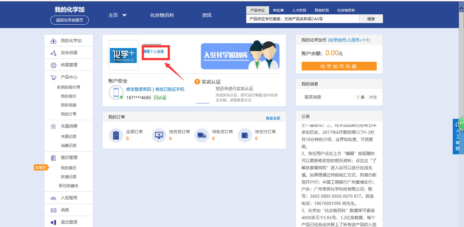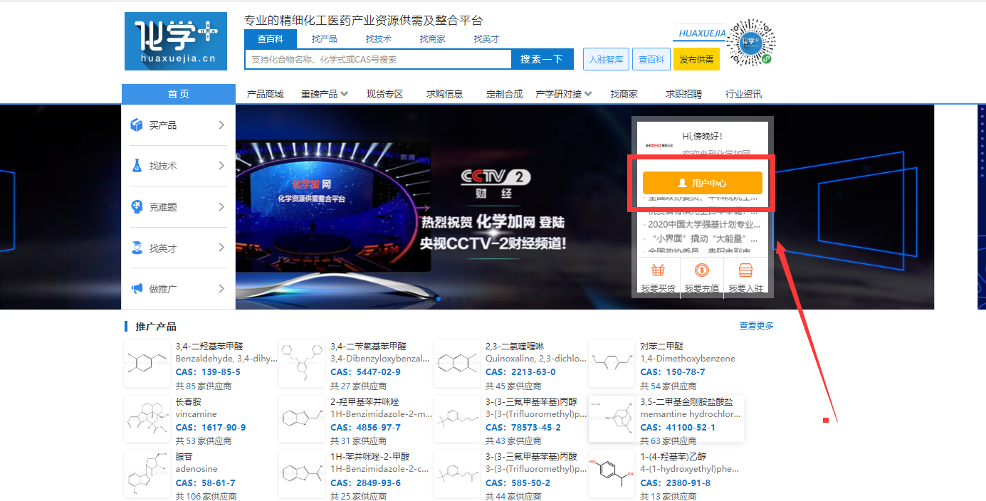 步驟二:注冊好之后在化學加網首頁點開“用戶中心”。