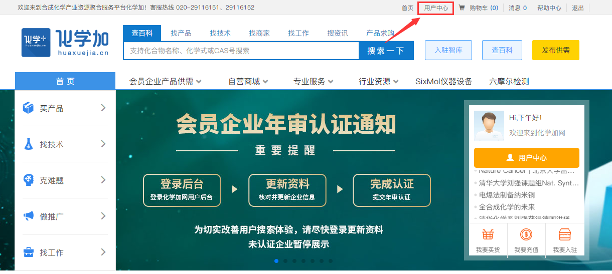 步驟四:化學加網工作人員會在一個工作日內完成審核,通過用戶中心首頁即可查看審核情況。