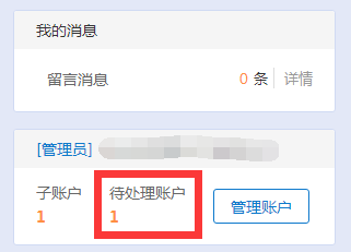 步驟一:登陸企業賬號并進入用戶中心,在右側會發現有“待處理賬戶”,點擊“管理賬戶”對其進行管理。