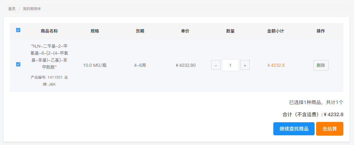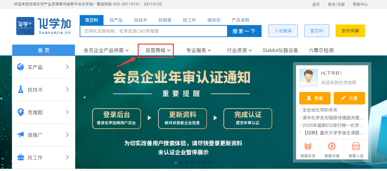 步驟一:登錄化學加網之后,下菜單欄點“自營商城”,或在搜索欄“找產品”一項,輸入您要尋找的產品中文名或者CAS號。
